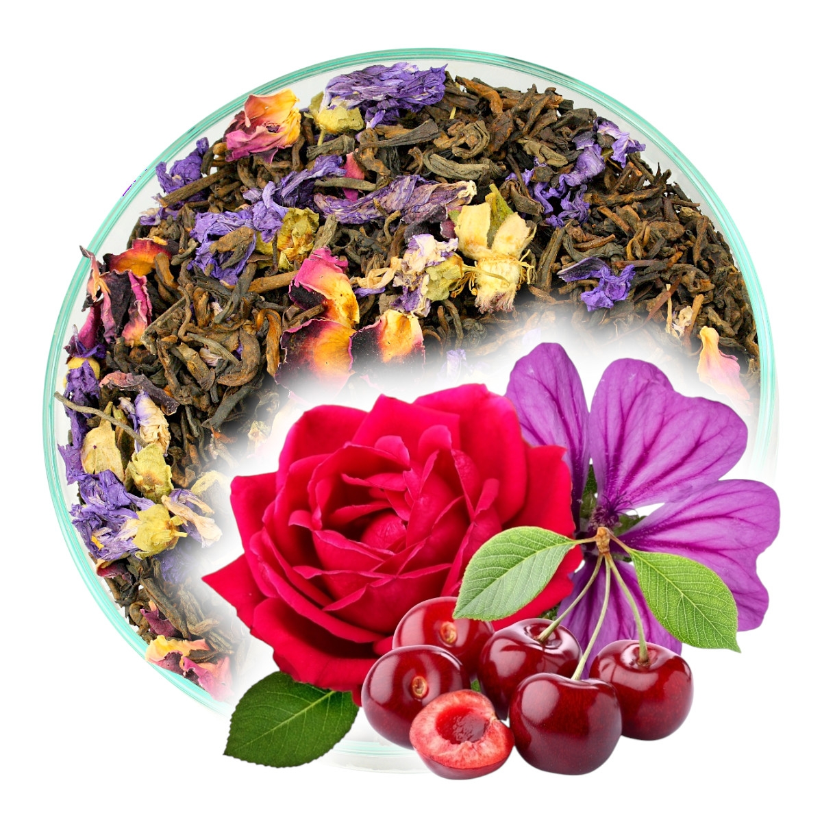 Pu-erh Jing Jang wzbogacona ciekawymi dodatkami, które zniekształcają naturalny smak czerwonej herbaty nadając jej wyjątkowego aromatu. W skład wchodzą kawałki drzewa sandałowego, kwiaty jaśminu i róży, liście curry, wiśnie i kurkuma.