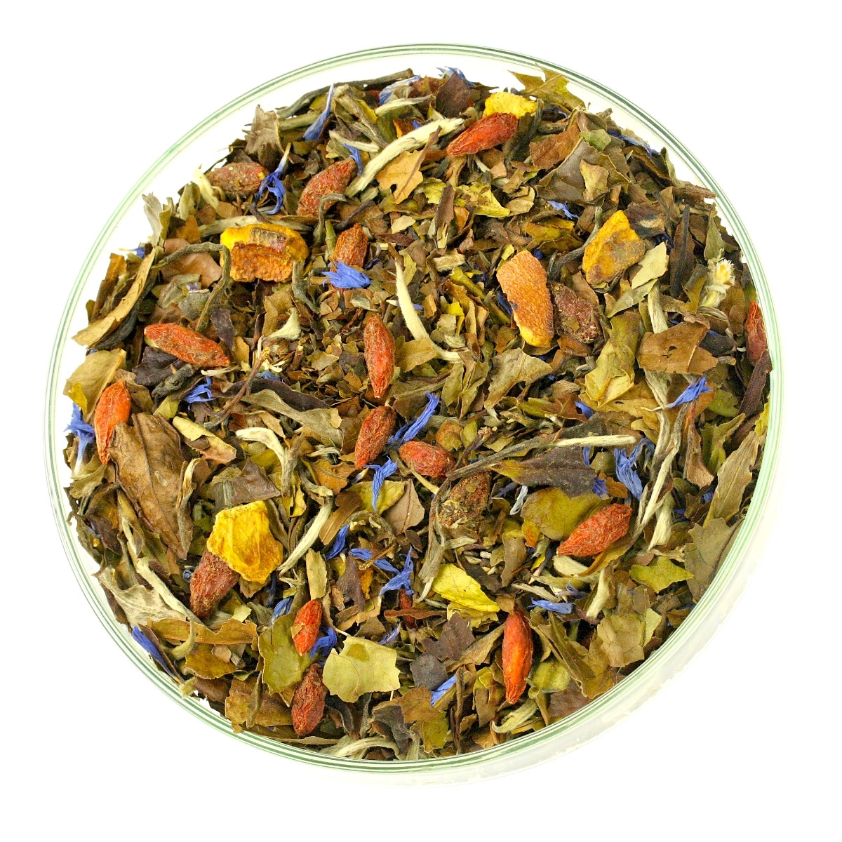 Składniki: Białe Herbaty: Shou Mei i Pai Mu Tan, jagody goji (Lycium chinese), skórka granatu, naturalny aromat słodkich moreli i białych winogron, biała herbata: Pu Erh Moonlight i Snow Buds, herbata zielona Green Monkey, płatki bławatka.