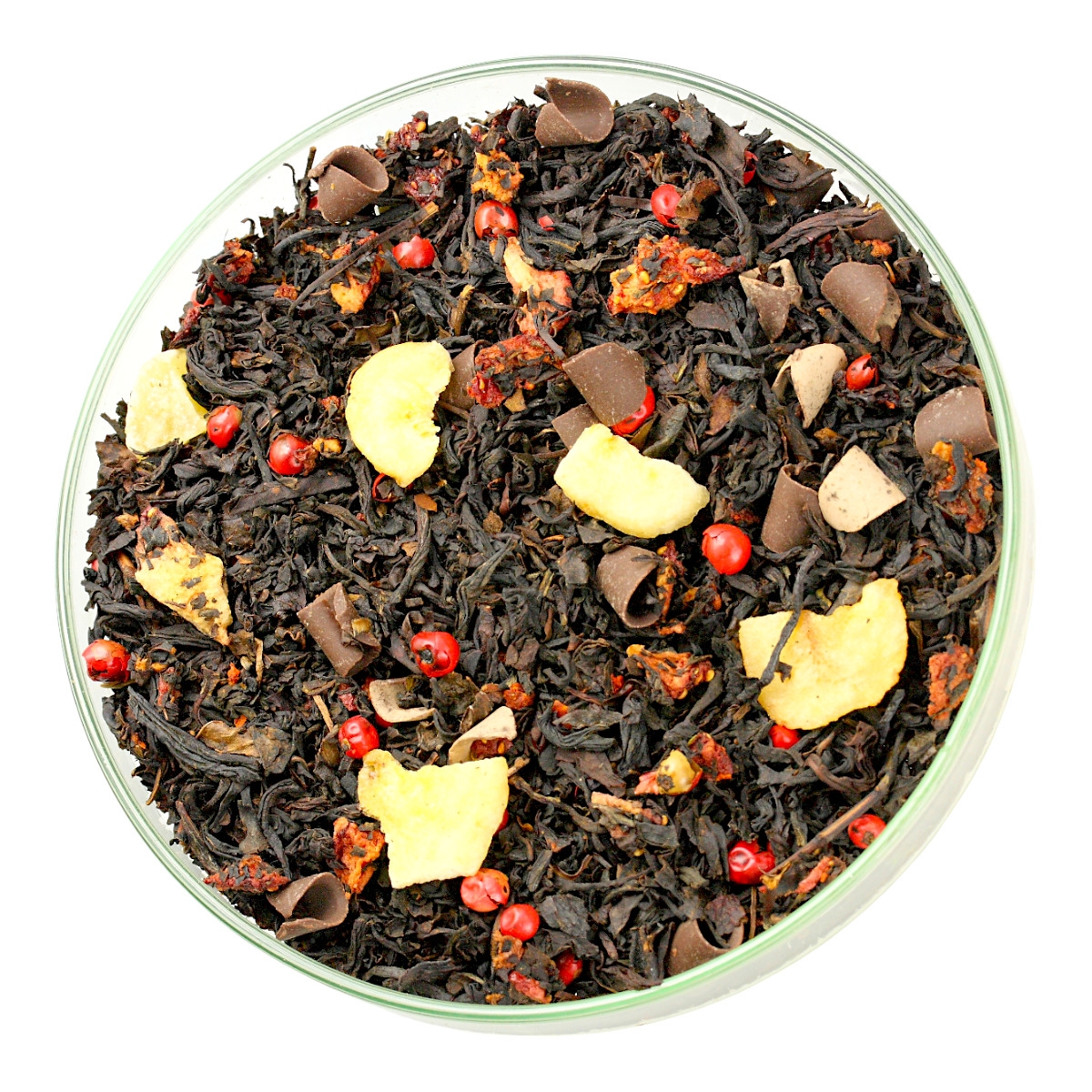 Składniki: Herbata Czarna, ananas kandyz (ananas cukier), CZEKOLADA (miazga kakaowa, cukier, tłuszcz kakaowy, olej maślany (MLEKO), emulgator E322 (SOJA), aromat, pieprz, truskawka liofilizat, banan (banan, olej kokosowy, cukier, aromat), papryka chili, aromat