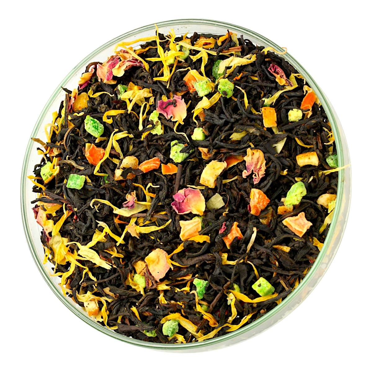 Składniki: Herbata Czarna, cytryna kandyz. (cytryna, cukier, E202, aromat, barwnik), pomarańcz kandyz. (skorka pomarańczy, E202, aromat) marchew liofilizat, płatki róży, nagietek, aromat.