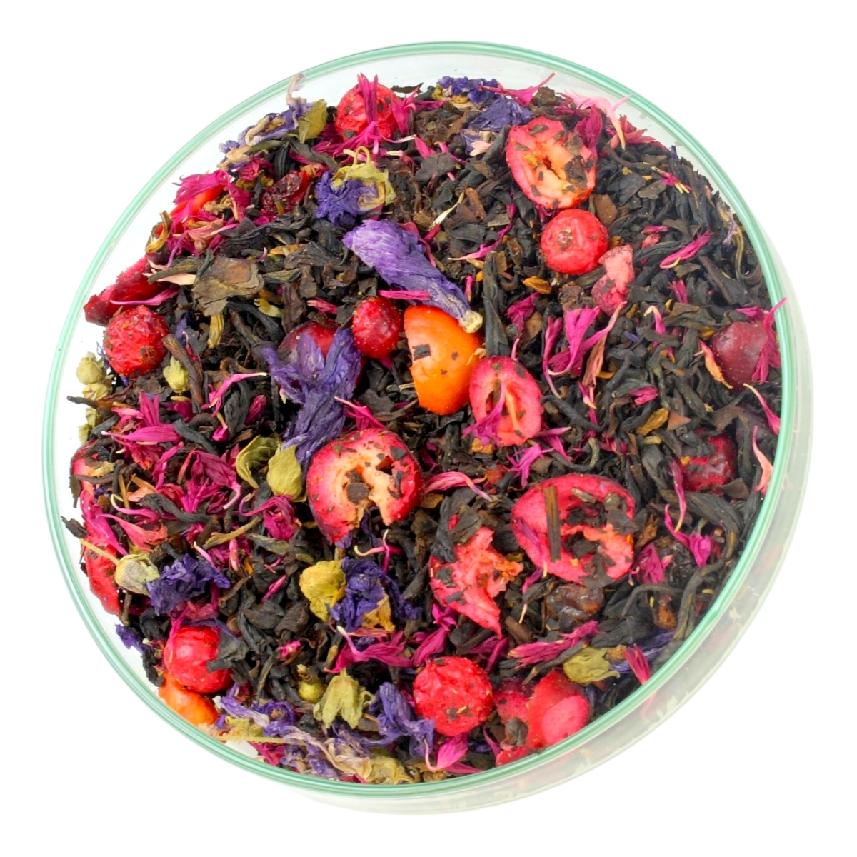 Składniki: Herbata Czarna, rodzynki (rodzynki, olej, konserwant E220) Cynamon, Imbir Kandyzowany (cukier, imbir), Czerwona Porzeczka, Ślaz, Żurawina liofilizowana, Bławatek Czerwony, Aromat.