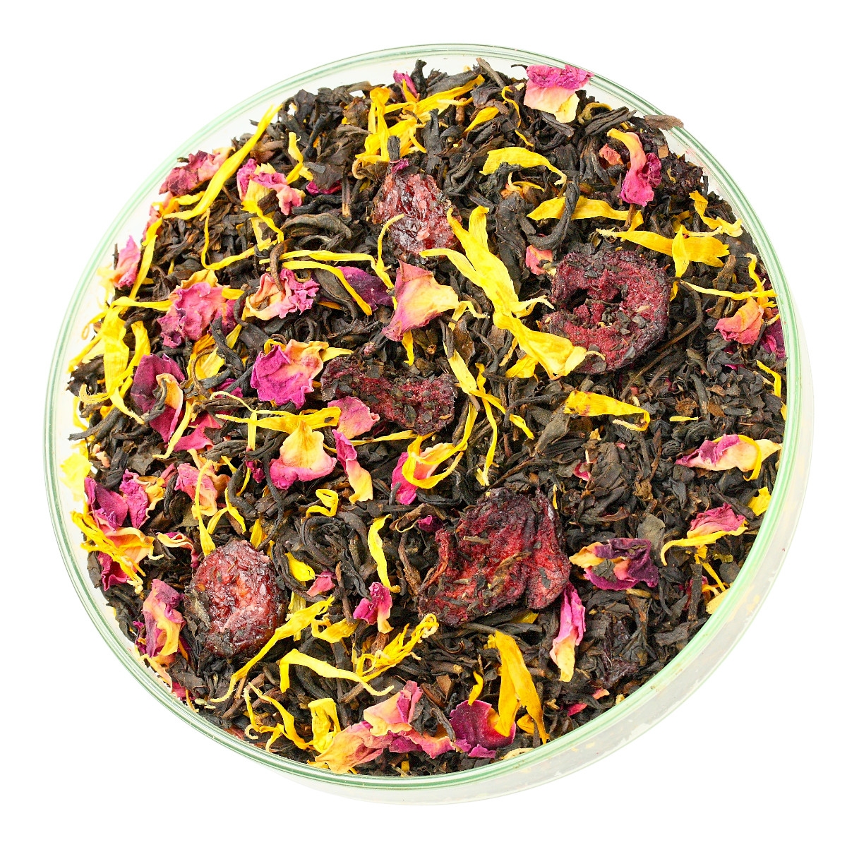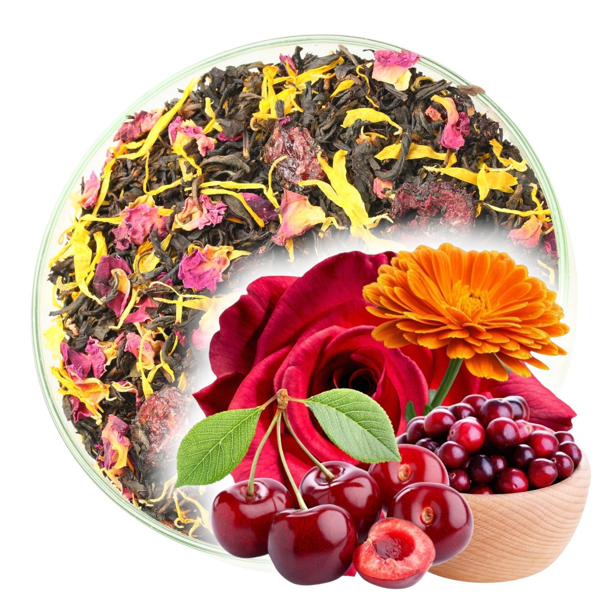Składniki: Herbata Czarna, rodzynki (rodzynki, olej, konserwant E220) Cynamon, Imbir Kandyzowany (cukier, imbir), Czerwona Porzeczka, Ślaz, Żurawina liofilizowana, Bławatek Czerwony, Aromat.