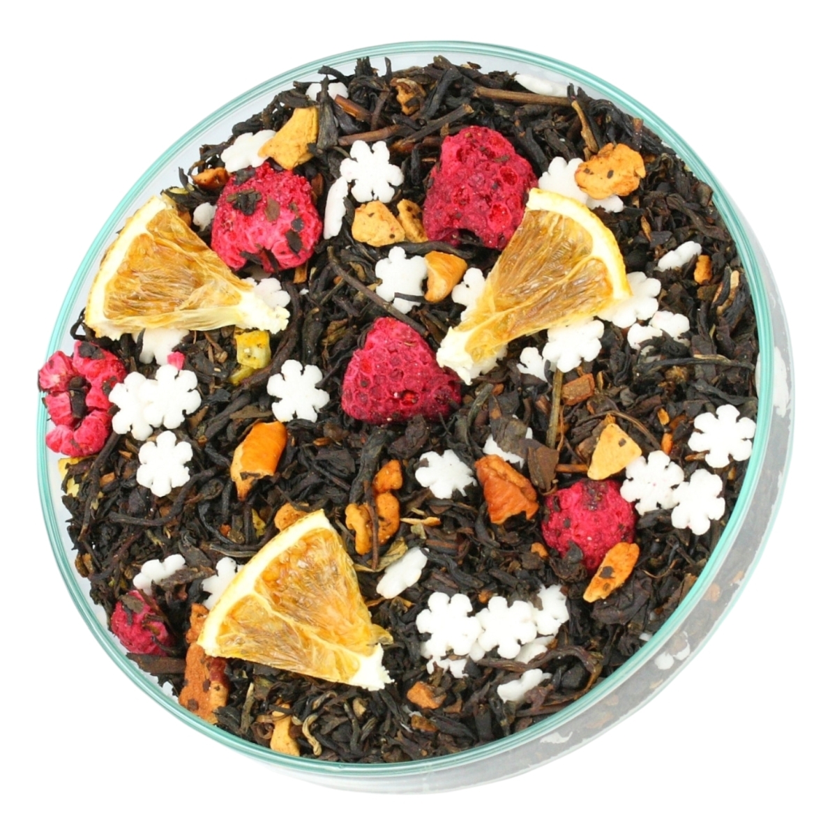 Składniki: Czarna Herbata, dekoracje cukrowe (cukier, mąka, olej, aromat), cynamon, jabłko, maliny liofilizowane, pomarańcze liofilizowane, aromat.