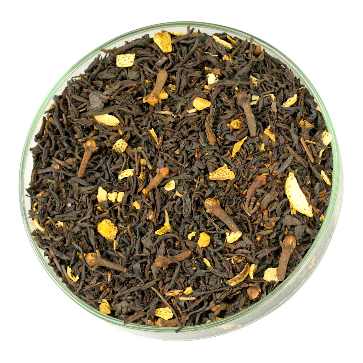 Składniki: Czarna herbata Assam India FOP (drobna), herbata Yunnan OP (grubszy liść), cynamon, skórka pomarańczy, imbir, kardamon, goździk, aromat.