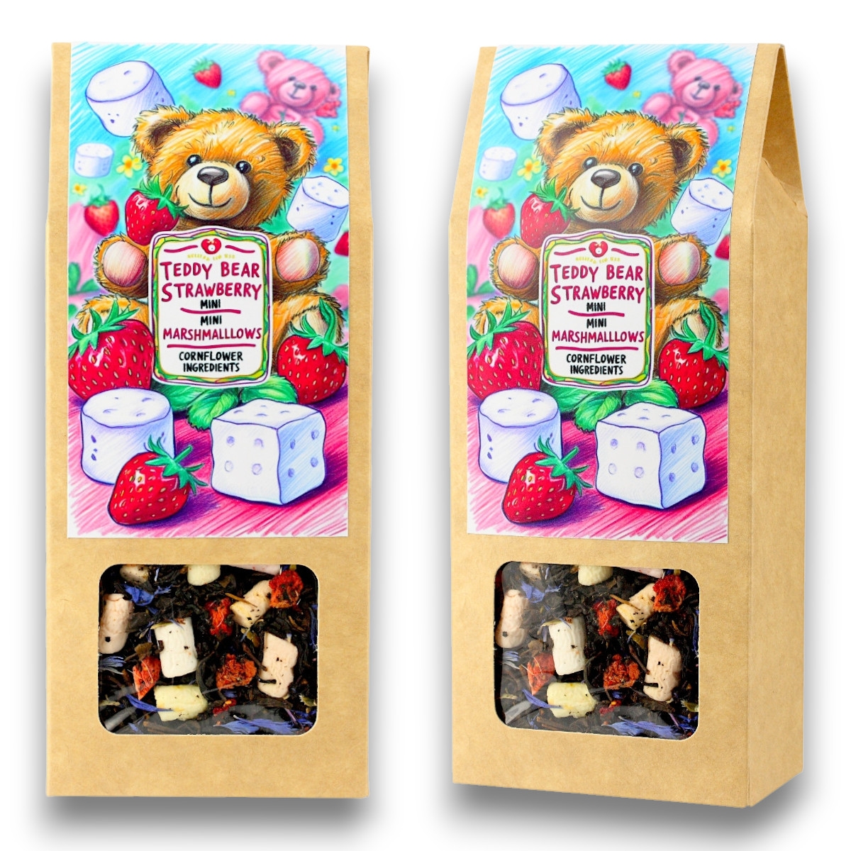Składniki: Herbata Czarna, dekoracje cukrowe - pianki (syrop glukozowo fruktozowy, cukier, woda), truskawka liofilizowana, aromat.