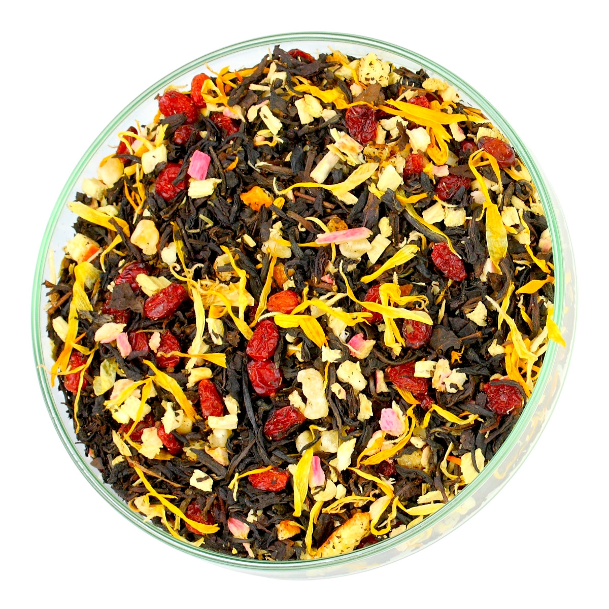 Składniki: Czarna herbata Yunnan, berberys, skórka pomarańczy kandyzowana, melon kandyzowany, rabarbar liofilizowany, nagietek, aromat