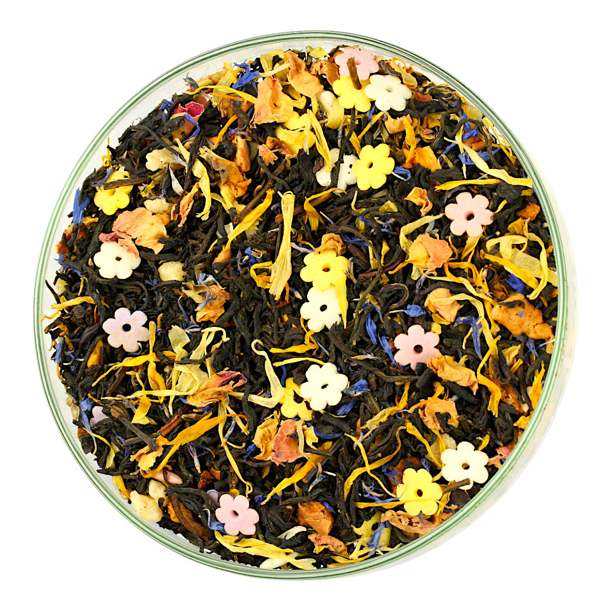 Składniki: Herbata Czarna Yunnan, dekoracje cukrowe (cukier, mąka ryżowa, olej ryżowy, skrobia ziemniaczana, aromat, koncentrat soku z buraków, barwniki E100, E101, E120, E132), melon kandyz. (cukier, regulator kwasowości - kwasek cytrynowy), płatki róży, bławatek, nagietek, aromat.