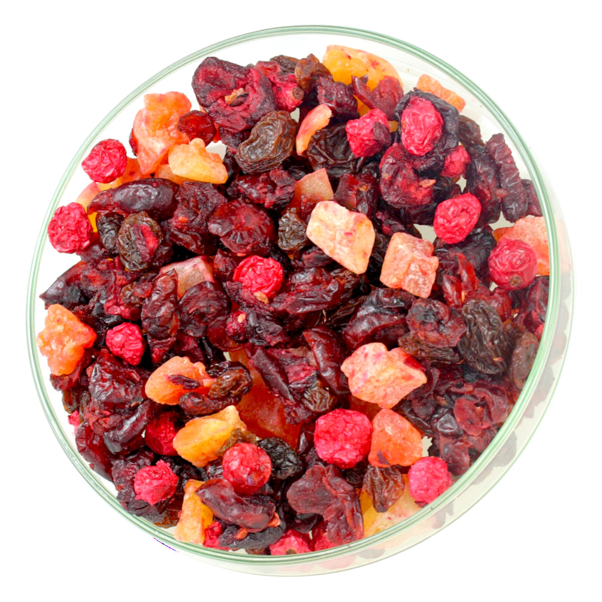 Składniki: Żurawina suszona (żurawina, cukier trzcinowy, olej słonecznikowy), papaja kandyz (papaja, cukier, subst. konserwująca SO2), rodzynki (rodzynki, olej słonecznikowy, subst. konserwująca E220), wiśnia liofilizat, czerwona porzeczka, aromat.