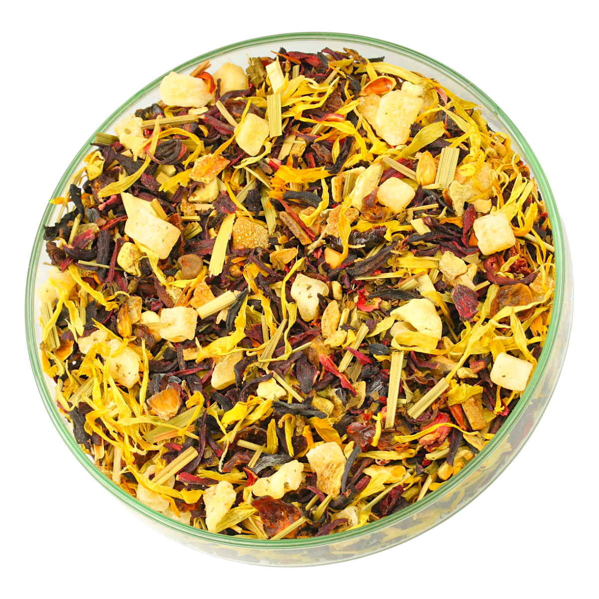 Odkryj wyjątkowy smak i aromat z naszą herbatą owocową „Cytrynowy Sorbet”. Ta unikalna kompozycja zawiera hibiskus, który nadaje naparowi głęboki czerwony kolor, oraz skórkę cytryny, która dodaje orzeźwiającej cytrusowej nuty. Kandyzowane kawałki melona i mango wprowadzają egzotyczną słodycz, podczas gdy skórka róży dodaje delikatności. Świeżość mięty pieprzowej i płatków nagietka harmonijnie współgra z aromatem trawy cytrynowej. Całość dopełnia aromat, który sprawia, że każda filiżanka tej herbaty to prawdziwa uczta dla zmysłów. Idealna na letnie dni, ale także jako rozgrzewający napój na chłodniejsze wieczory. Spróbuj i pozwól się oczarować!