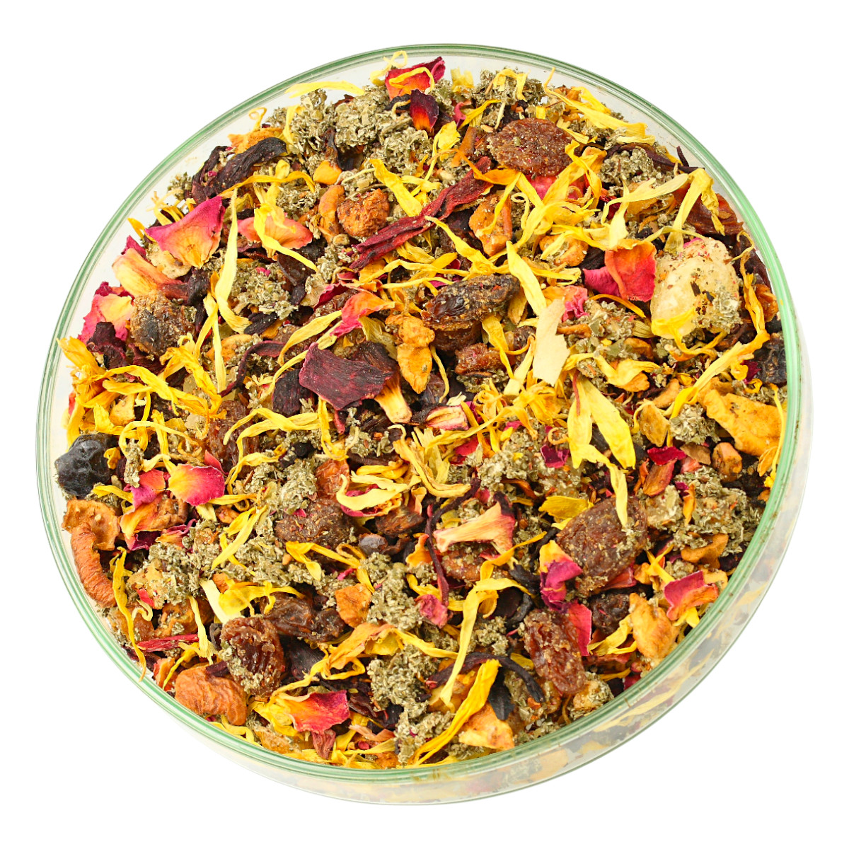Składniki: hibiskus, jabłko, pomarańcza kandy. (skórka pomarańczy, cukier, kwasek cytrynowy, subst. kons. E202, aromat), rodzynki (cukier, olej), ananas kandyz. (ananas, cukier, SO2), HoneyBush, skórka róży, liść maliny, płatki róży, nagietek, aromat.