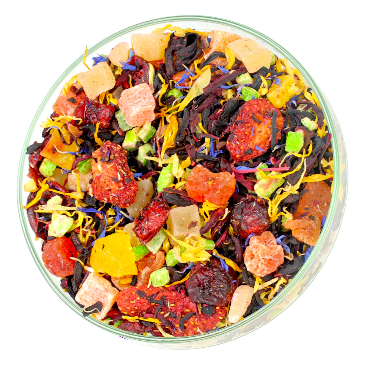 Składniki: Hibiskus, Ananas Kandyz (ananas, cukier), Mango Kandyz, Cytryna Kandyz, Papaja Kandyz i Melon Kandyz (mango, papaja, cytryna, melon, cukier, regulator kwasowości E330, konserwant SO2, aromat), żurawina suszona (żurawina, cukier, olej), truskawka liofilizat, bławatek, nagietek, aromat.