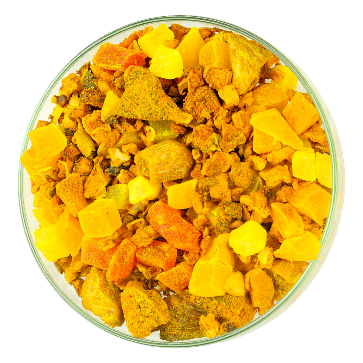 Składniki: Jabłko suszone, ananas kandyzowany (ananas, cukier), figa suszona, mango kandyzowane i papaja kandyzowana (cukier, kwasek cytrynowy, konserwant SO2), kurkuma, aromat.