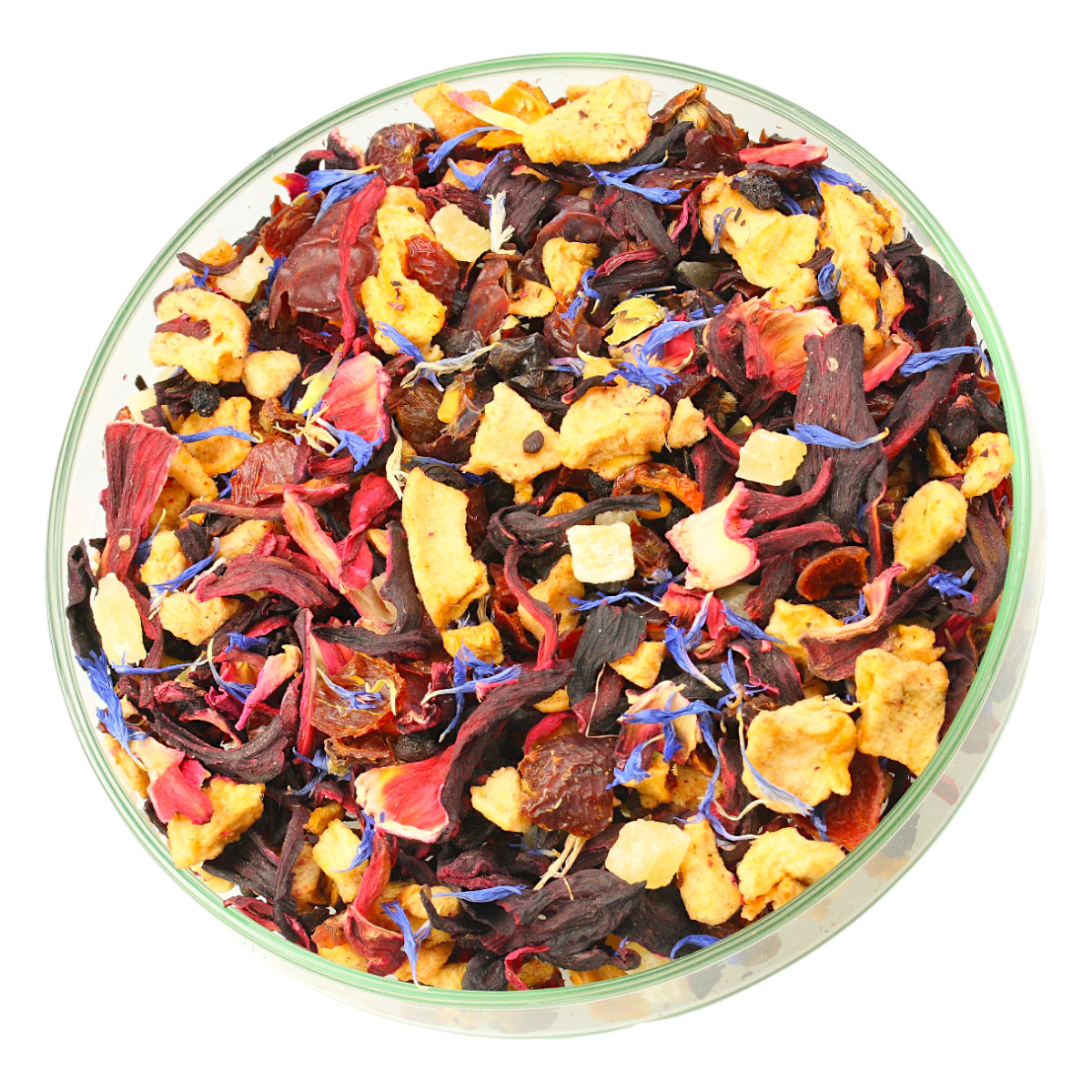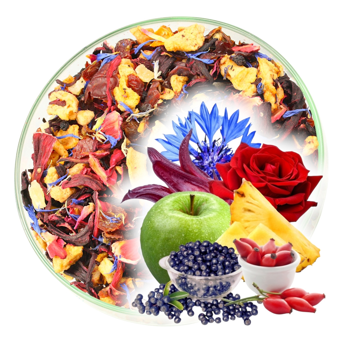 Składniki: Hibiskus płatek, skórka dzikiej róży, jabłko owoc, czarny bez owoc, ananas kandyzowany, rodzynka, płatki róży, płatki bławatka, aromat.