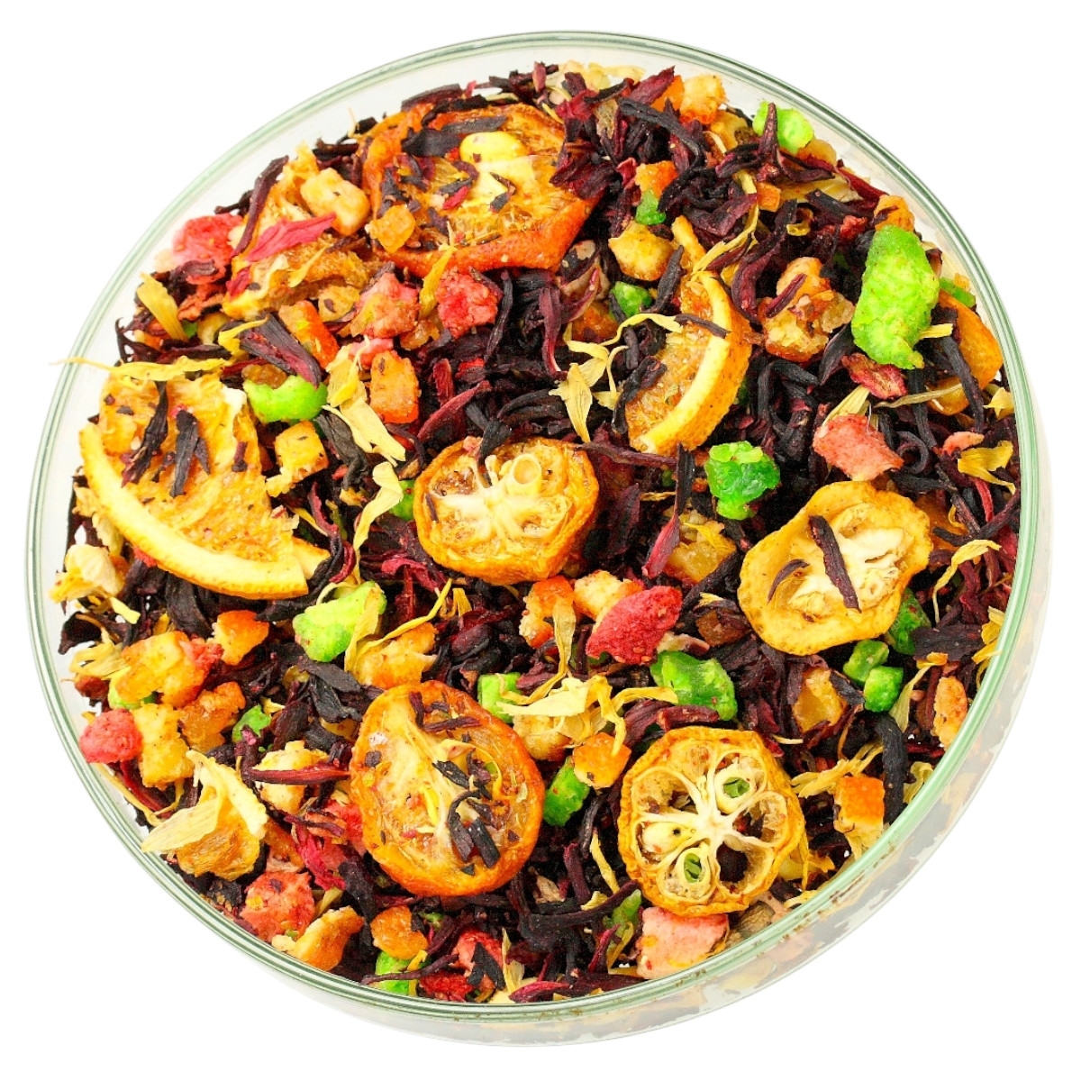 Składniki: Hibiskus, cytryna i pomarańcza kandyzowane (cukier, syrop glukozowy, konserwant E202, kwasek cytrynowy, barwniki E133, E102, aromat), kumkwat, pomarańcza suszona, truskawka liofilizowana, nagietek, aromat.