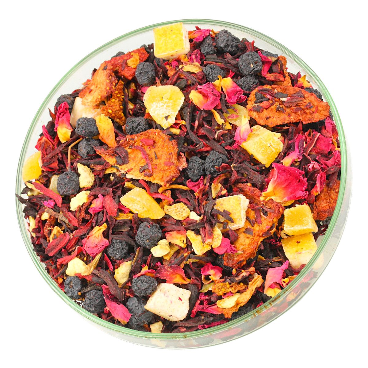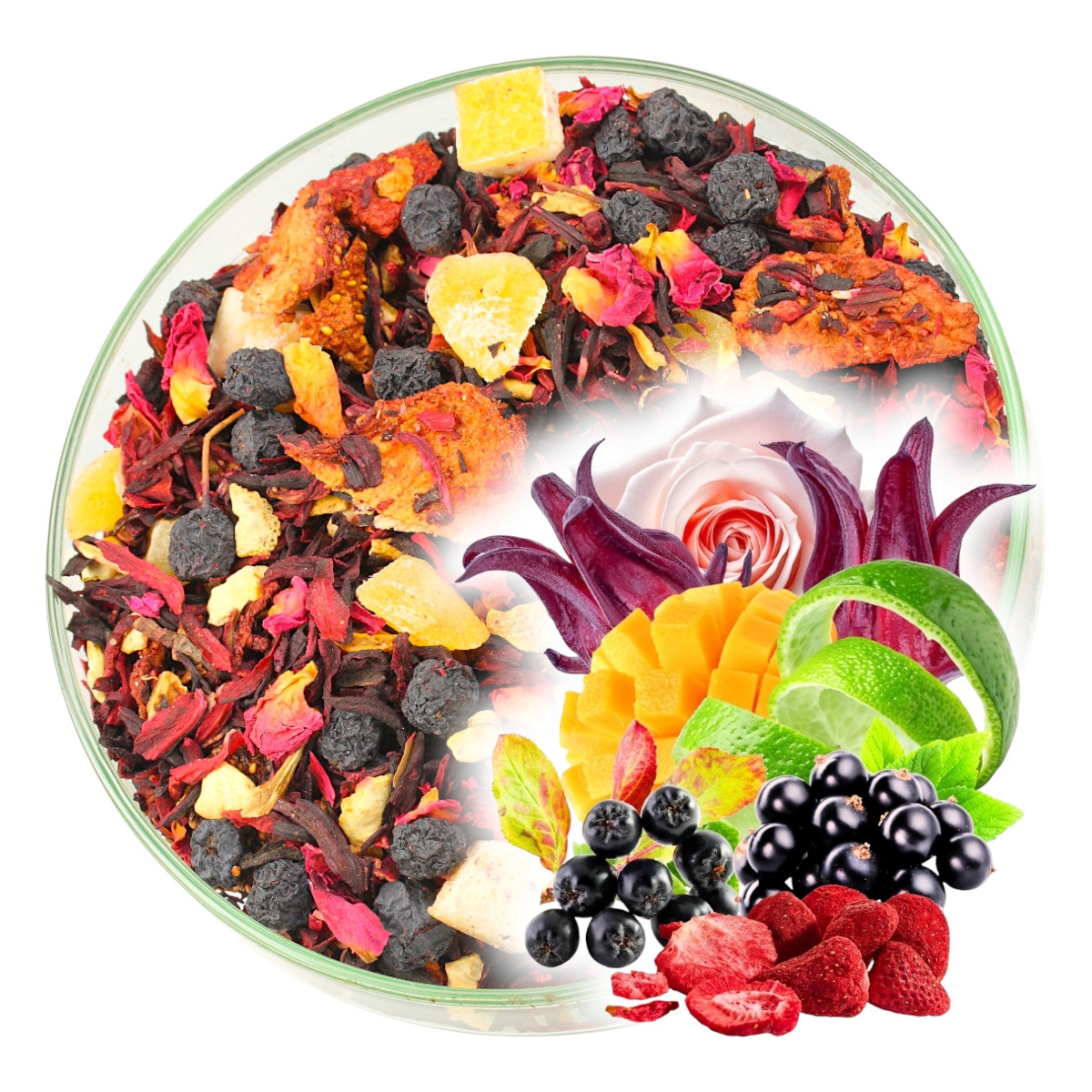 Składniki: Hibiskus, aronia, czarna porzeczka, mango kandyz (mango, cukier, regulator kwasowości - kwasek cytrynowy), skórka cytryny, truskawka liofilizat, melon kandyz (melon, cukier, regulator kwasowości - kwasek cytrynowy, konserwant SO2), płatki róży, aromat (kompozycja owoców 51%)