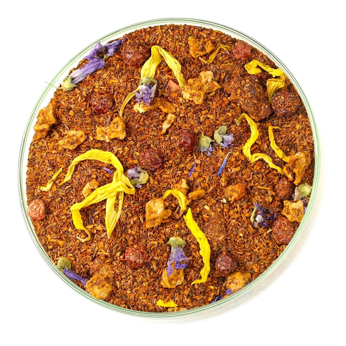 Składniki: Rooibos, Liofilizowane Truskawki, Liofilizowane Porzeczki, Kawałki Jabłka, Kwiat Słonecznika, Kwiat Bławatka, Aromat.