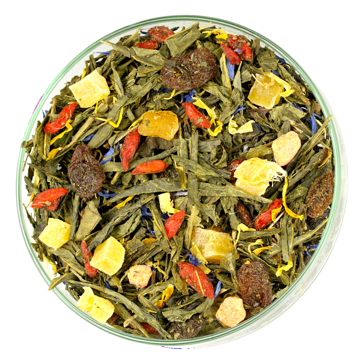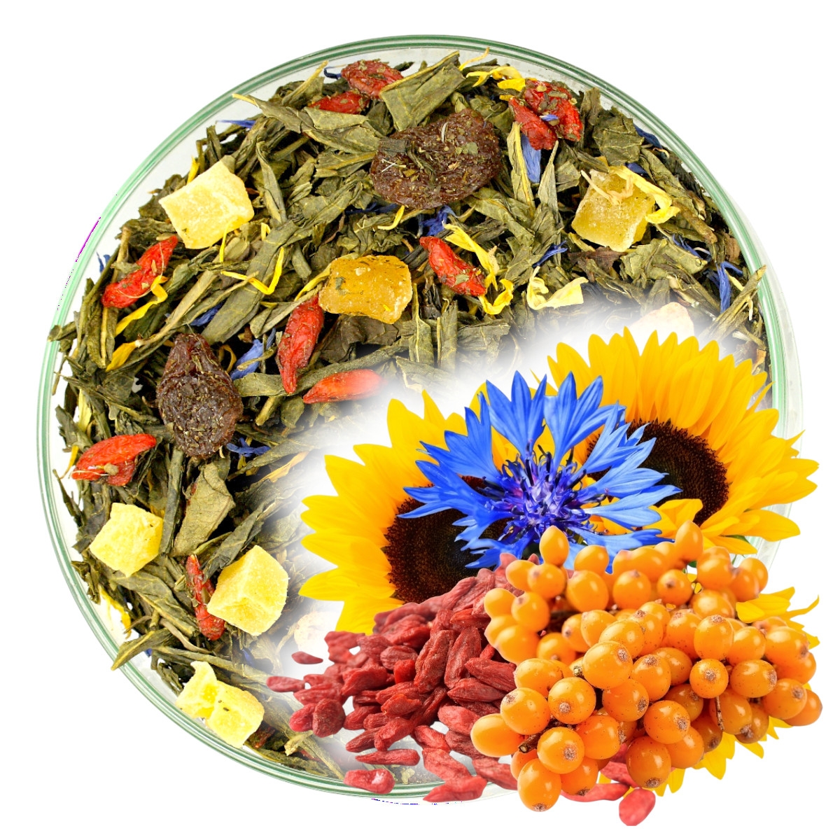 Składniki: Sencha, rokitnik, cukier witaminowy, owoc goji, bławatek, słonecznik, aromat.