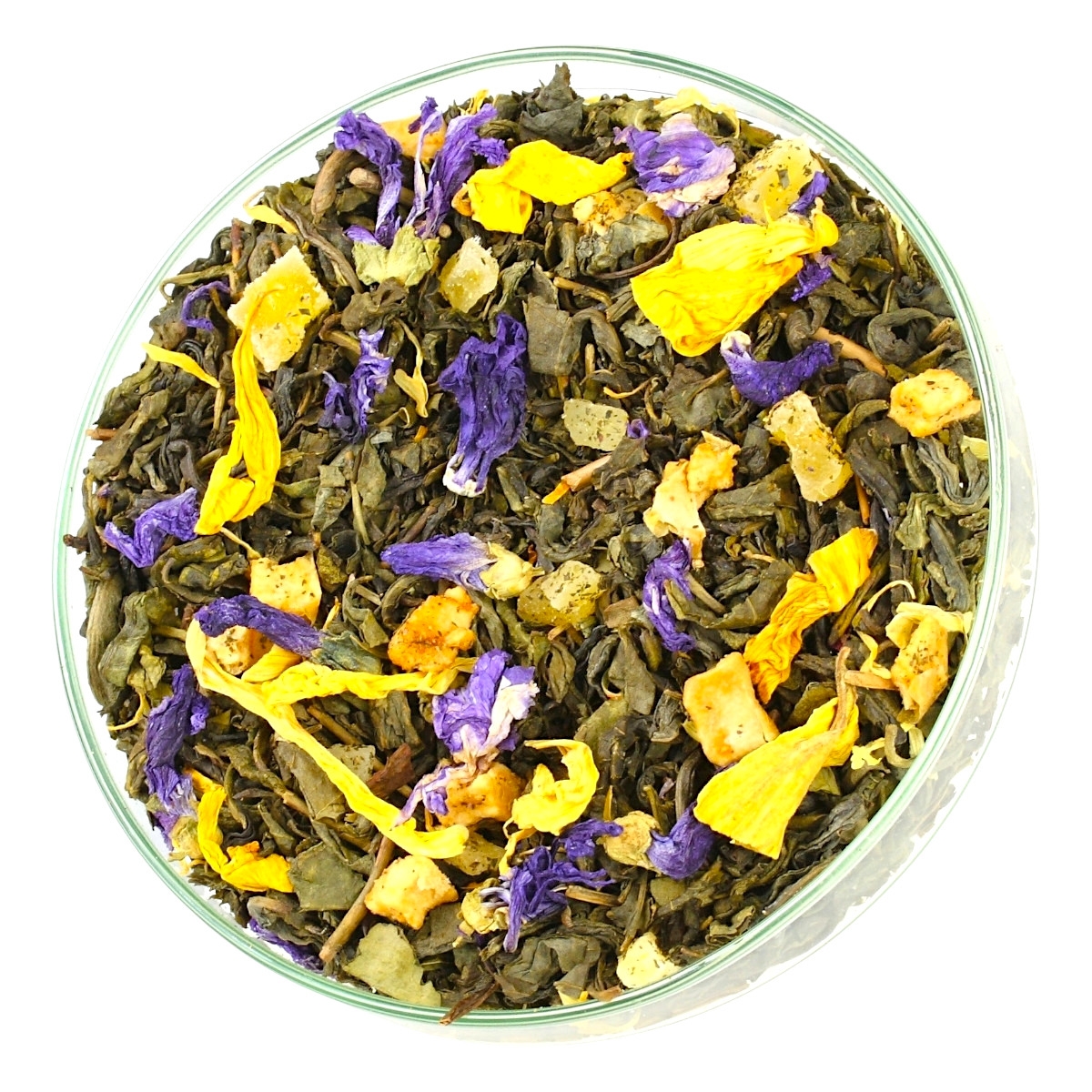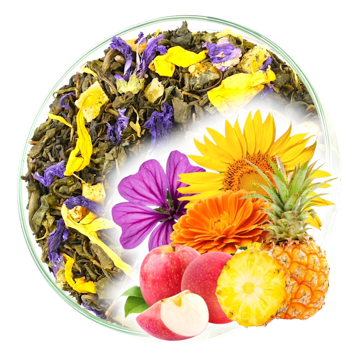 Składniki: Herbata zielona liść, ananas kandyzowany, jabłko owoc, kwiat ślazu, płatki nagietka, płatki słonecznika, aromat.