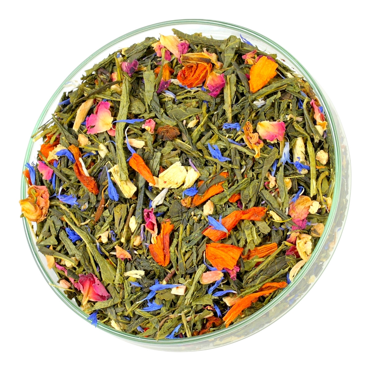 Składniki: Herbata zielona Sencha, kwiat lilii, rabarbar liofilizat, bławatek, płatki róży, aromat.