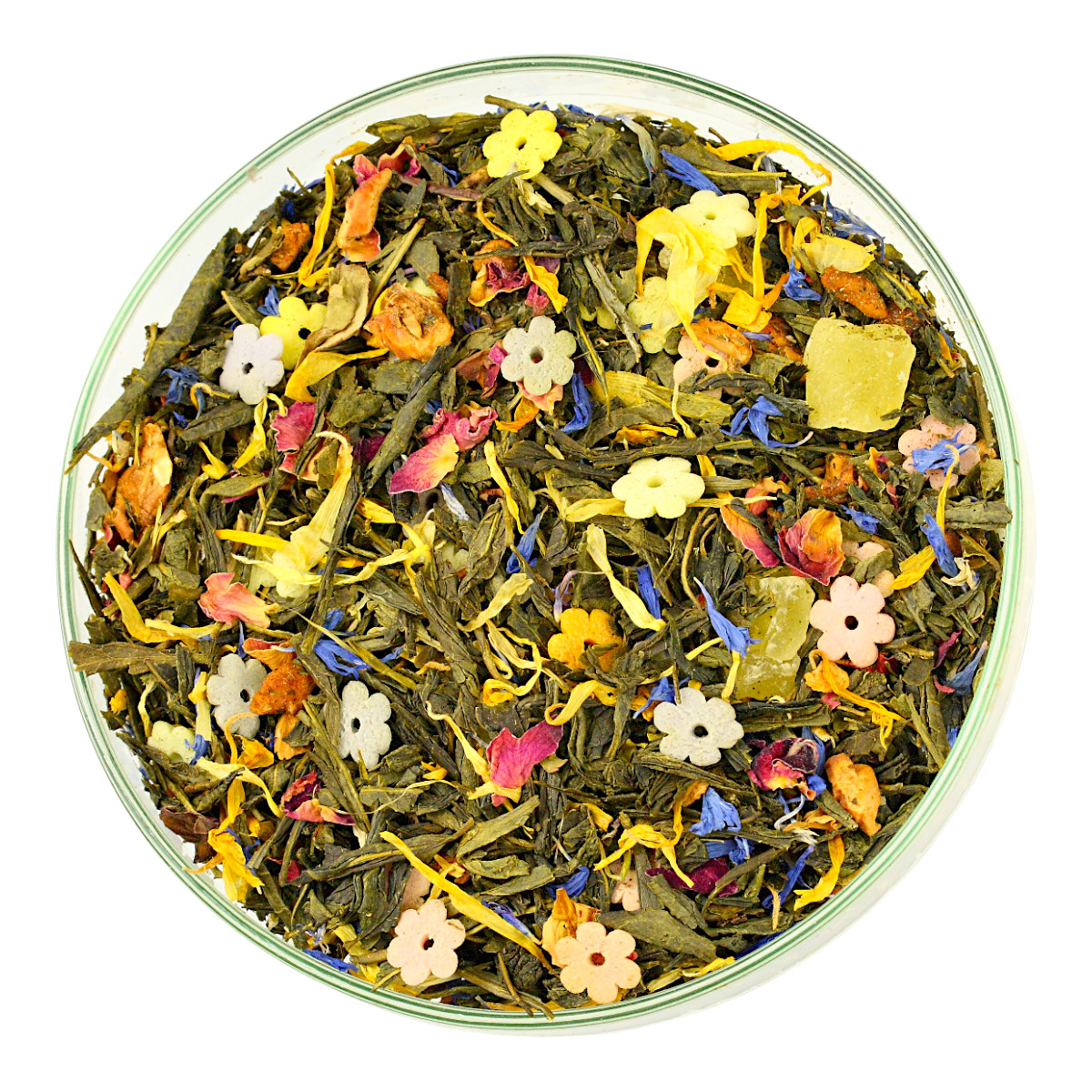 Składniki: Herbata Zielona Sencha, dekoracje cukrowe (cukier, mąka ryżowa, olej ryżowy, skrobia ziemniaczana, aromat, koncentrat soku z buraków, barwniki E100, E101, E120, E132), melon kandyz. (cukier, regulator kwasowości - kwasek cytrynowy), płatki róży, bławatek, nagietek, aromat.