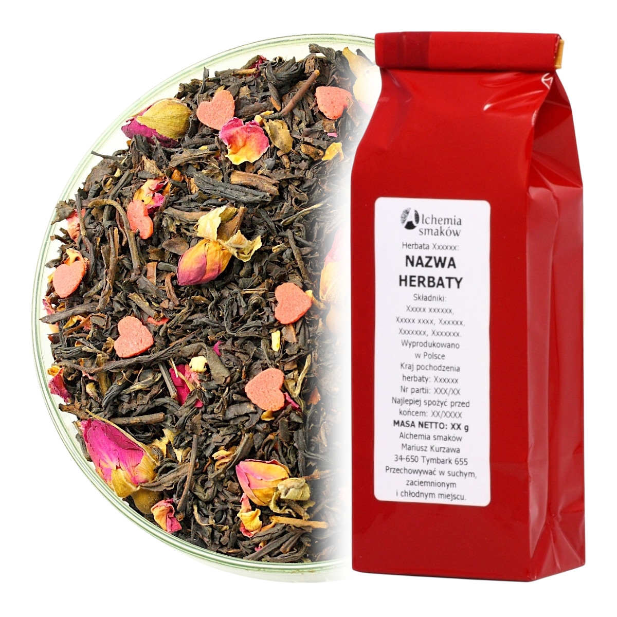 Czarna herbata, z dodatkiem różowych i białych serduszek o smaku słodkiego karmelu.
