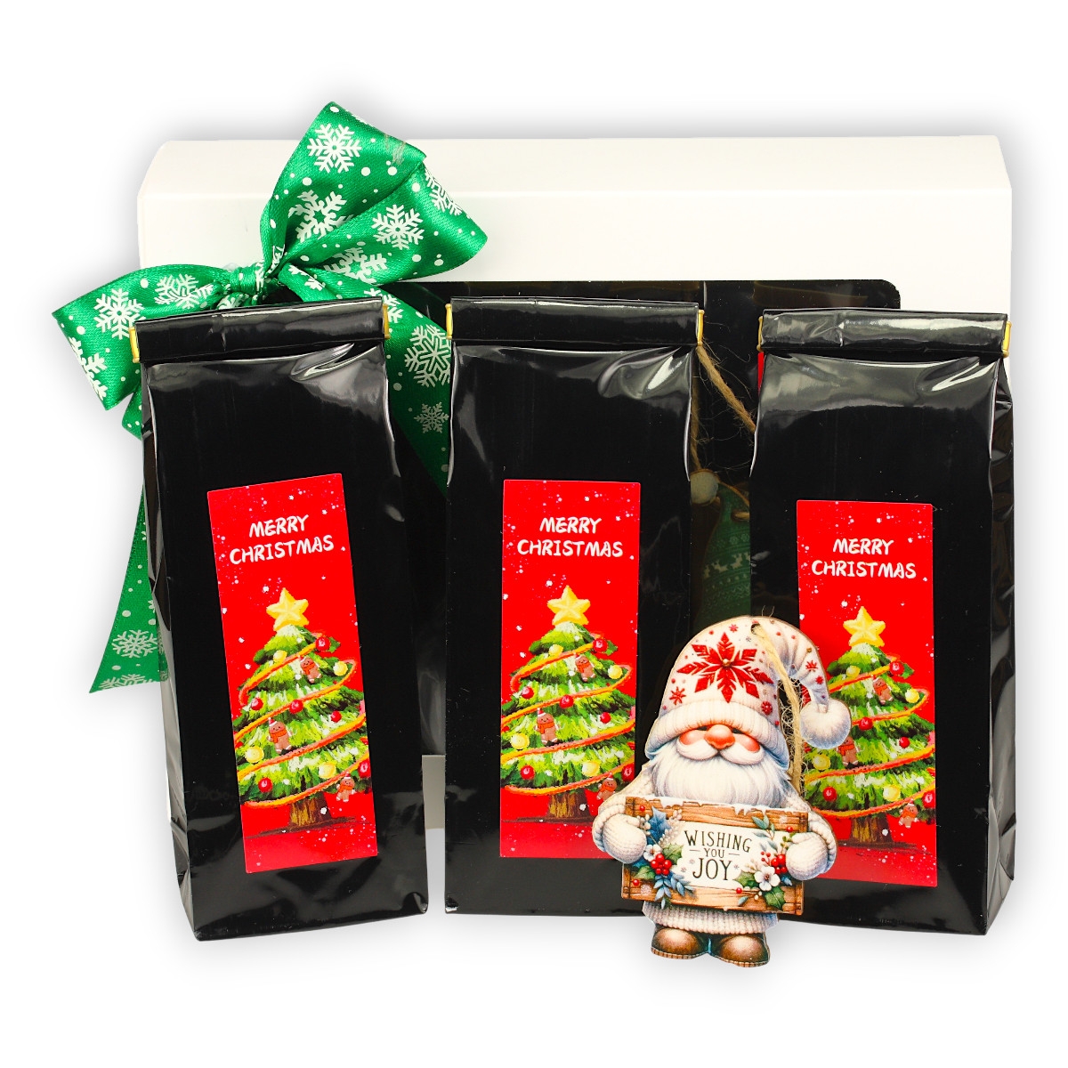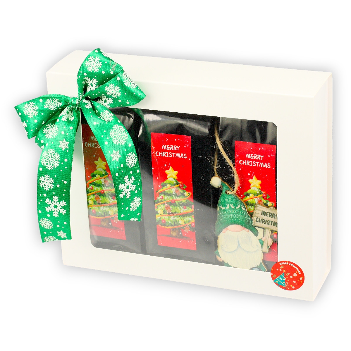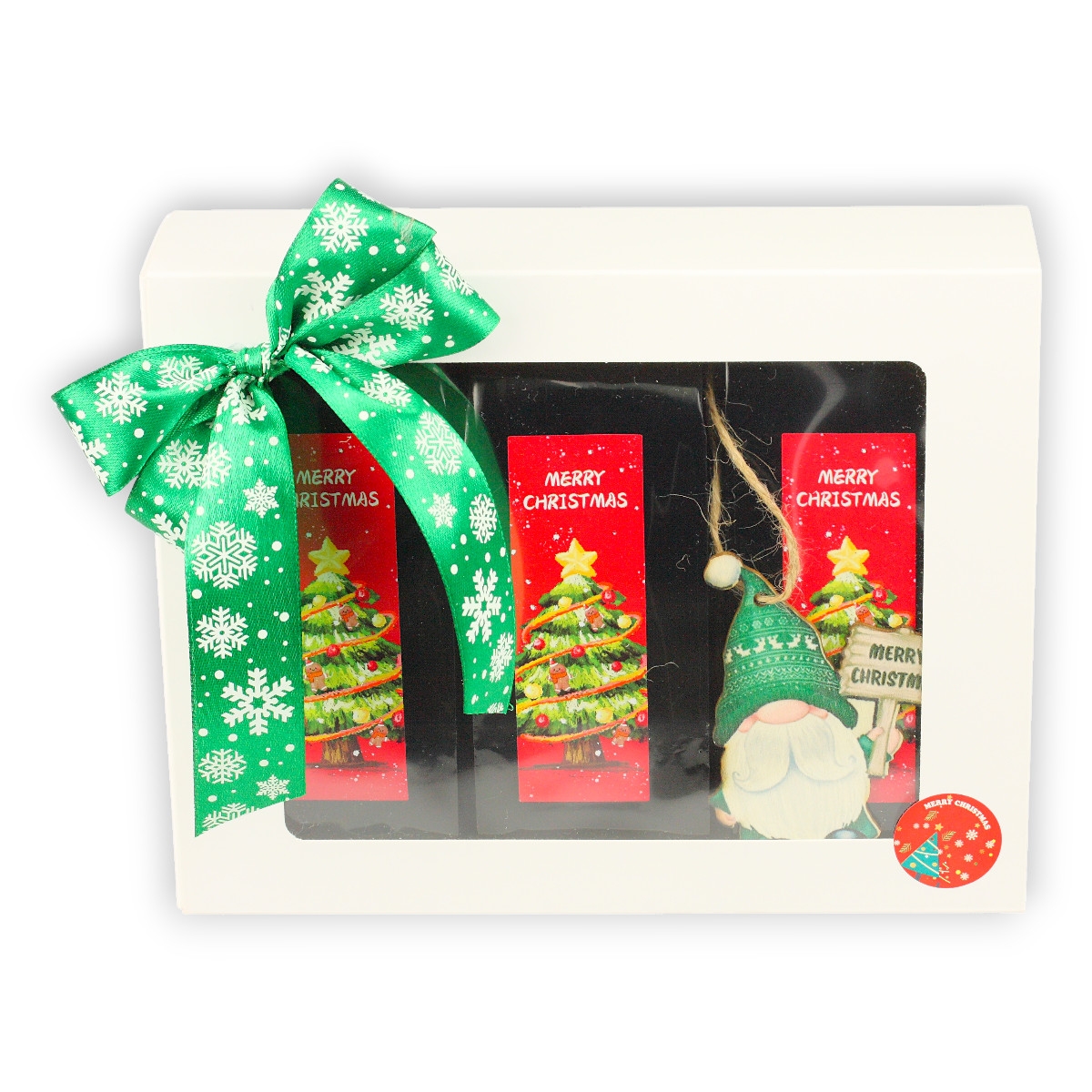 Odkryj wyjątkowy zestaw świąteczny, który zadowoli każdego miłośnika herbaty. Nasz biały kartonik kryje w sobie trzy wyborne herbaty: czarną Jabłkowo Cynamonową, zieloną White Christmas oraz owocową Szarlotkę Pychotkę. Każda z nich zamknięta jest w ozdobnej czarnej torebce, co dodaje całości elegancji. Dodatkowo, w zestawie znajduje się drewniana ozdoba na choinkę, idealna jako pamiątka na lata. Całość przyozdobiona jest ręcznie wykonaną kokardą i stylową naklejką, co sprawia, że zestaw prezentuje się niezwykle estetycznie i z klasą. To doskonały wybór na prezent świąteczny, który zachwyci każdego obdarowanego!
