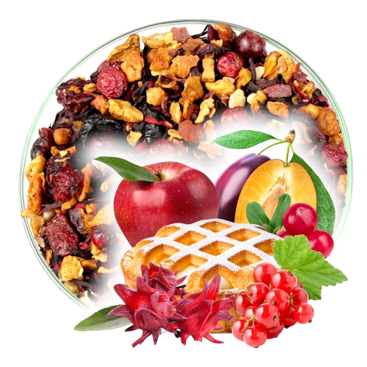 Składniki: Hibiskus, jabłko, melon kandyz. (melon, cukier, kwasek cytrynowy), śliwka (śliwka suszona, olej, sorbinian potasu), żurawina suszona (żurawina, cukier trzcinowy, olej), czerwona porzeczka, aromat. (kompozycja owoców 65%)