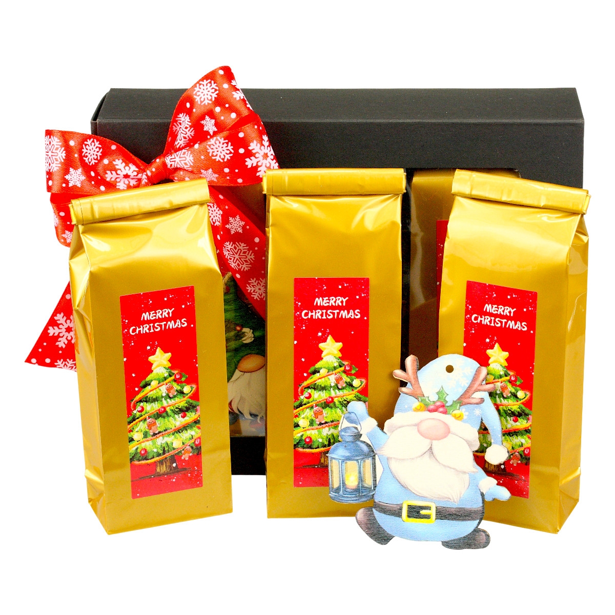 Zanurz się w magicznym świecie smaków z naszym zestawem świątecznym! Elegancki czarny kartonik kryje w sobie trzy wyjątkowe herbaty: Czarną Wigilijny Wieczór, Zieloną Dziadek Do Orzechów oraz owocową Królewnę Śnieżkę. Każda z nich zapakowana jest w ozdobną złotą torebkę, która podkreśla ich wyjątkowość. Do zestawu dołączona jest ręcznie wykonana drewniana ozdoba na choinkę, która doda blasku Twoim świątecznym dekoracjom. Całość dopełnia ręcznie wykonana kokarda oraz stylowa naklejka. Idealny prezent na święta!