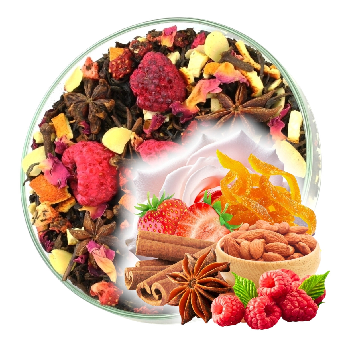 Składniki: Herbata Czarna, anyż, skórka pomarańczy, MIGDAŁY, goździki, cynamon, płatki róży, truskawka liofilizowana, malina, aromat.