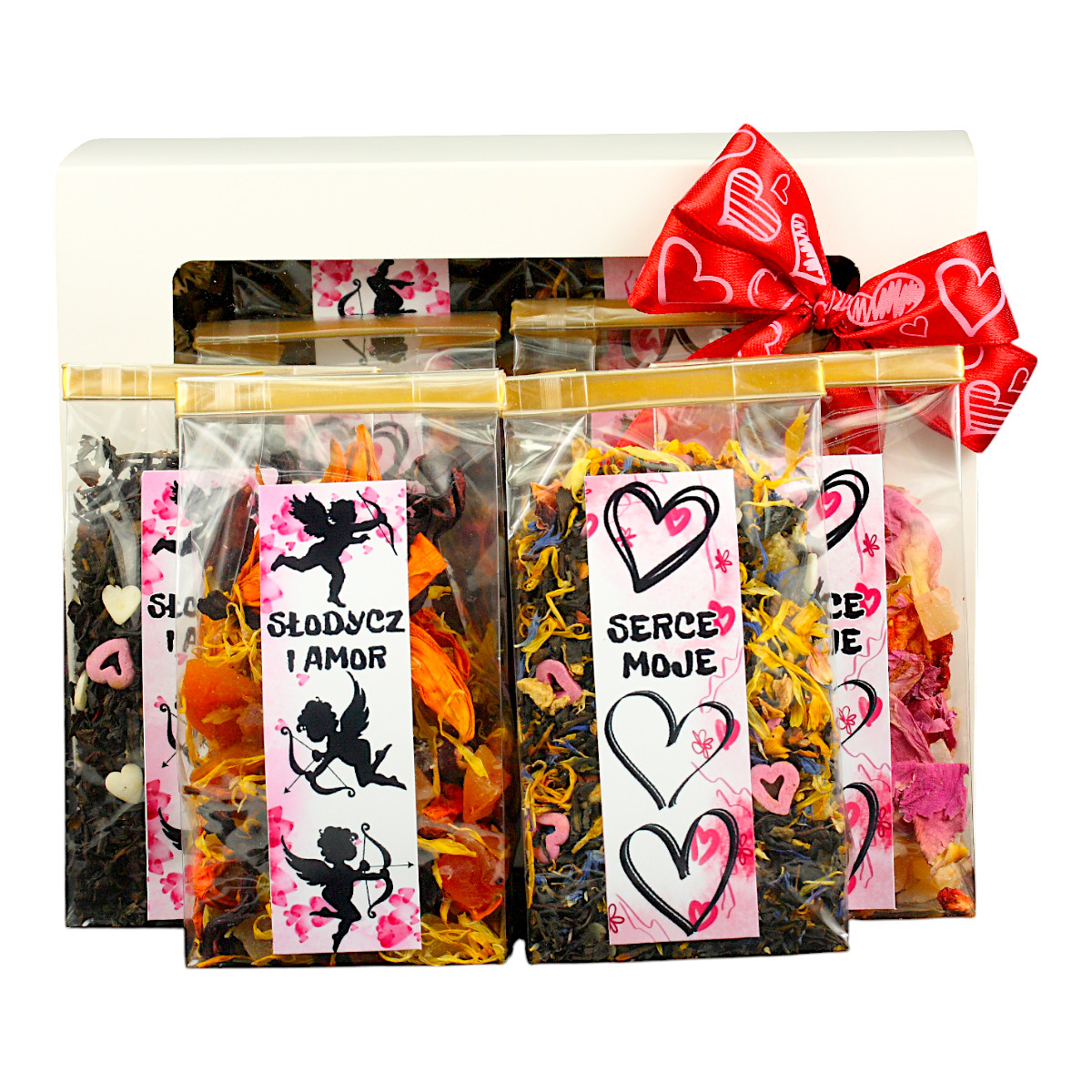 Nasz zestaw herbat zapakowany jest w biały kartonik z dekoracjami i kokardą, co dodaje mu elegancji i uroku. Kolorowe opakowanie jest jak stworzone na Walentynki, subtelnie nawiązując do miłości i ciepła, które towarzyszą temu świętu. To estetyczne i starannie wykonane opakowanie sprawia, że herbata staje się nie tylko napojem, ale i symbolem uczucia, które chcesz wyrazić.