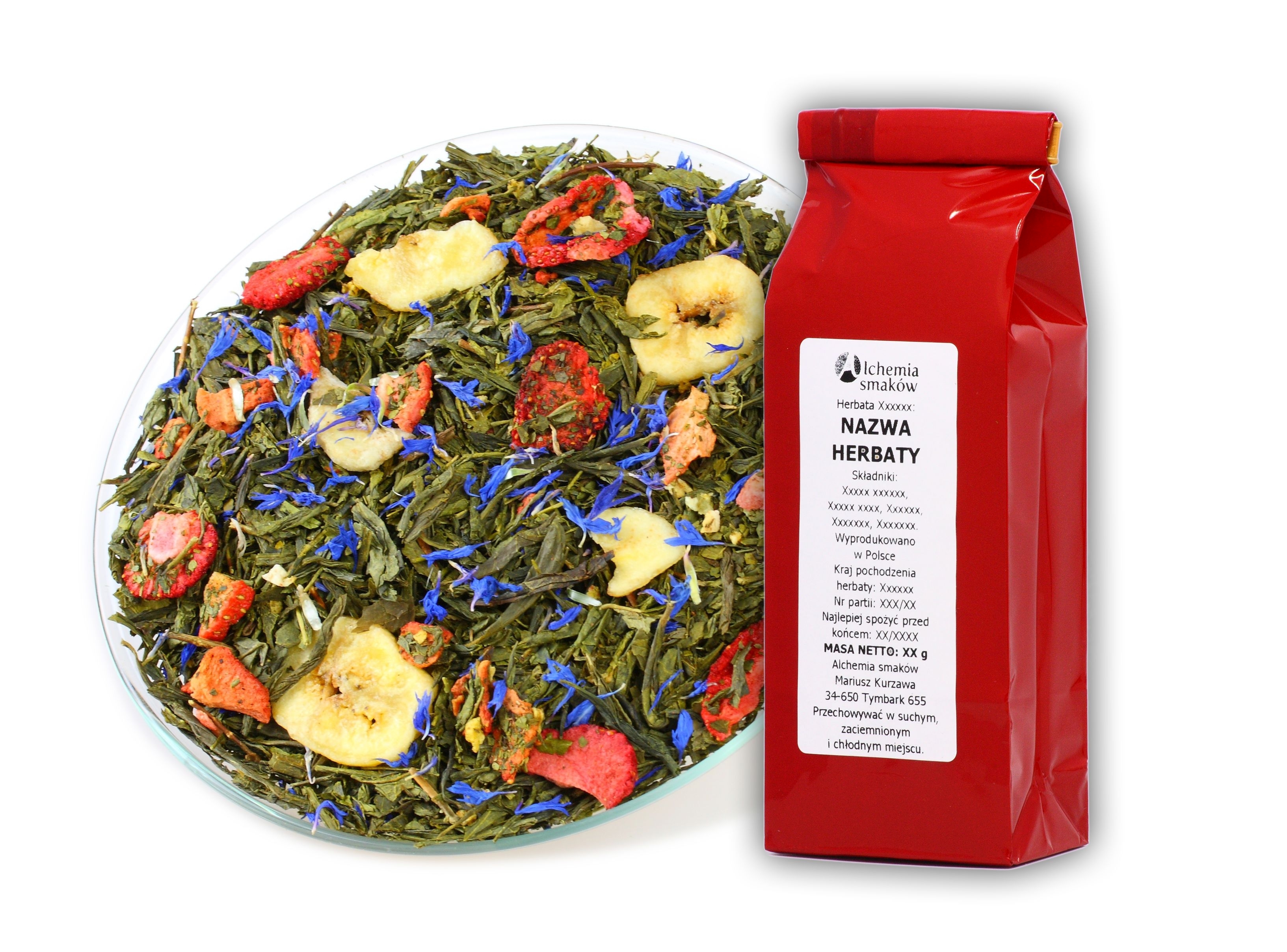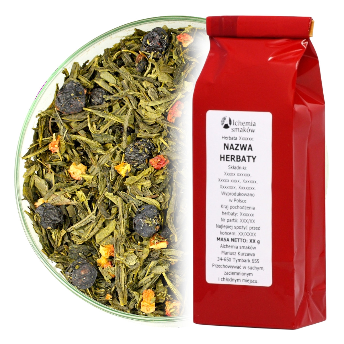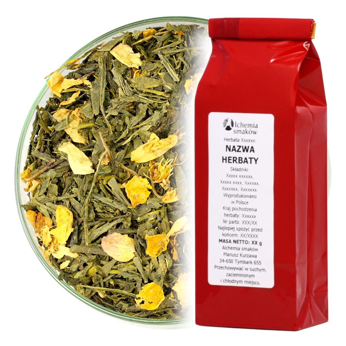 Połączenie zielonej herbaty Sencha z Gunpowder Temple of Heaven oraz dodatkami.