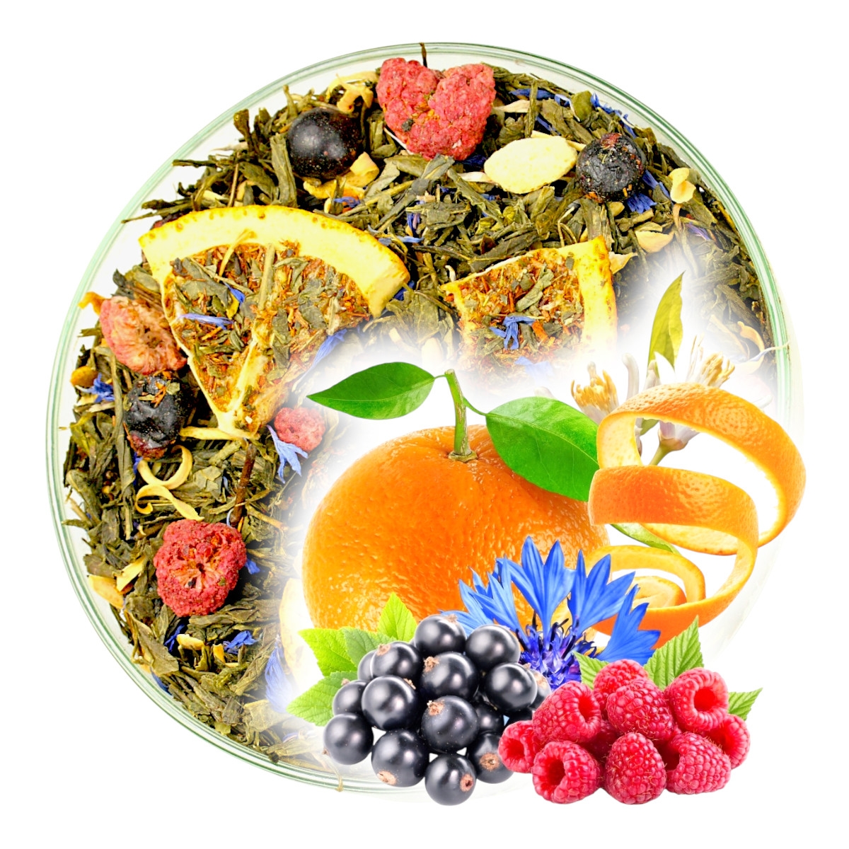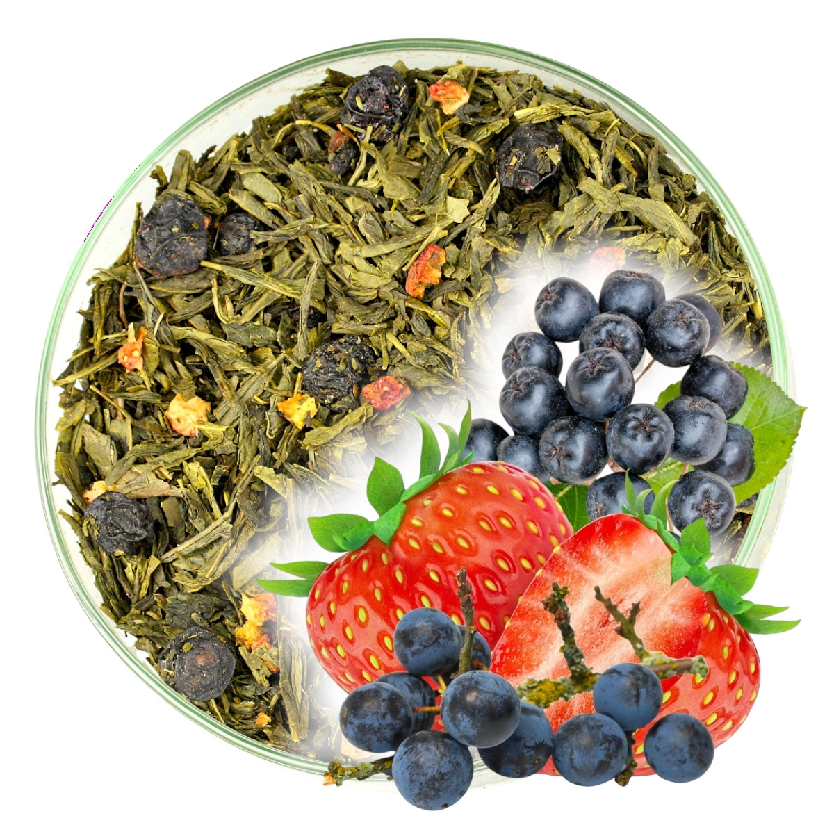 Zielona Sencha wzbogacona owocami lasu oraz ciekawym aromatem.